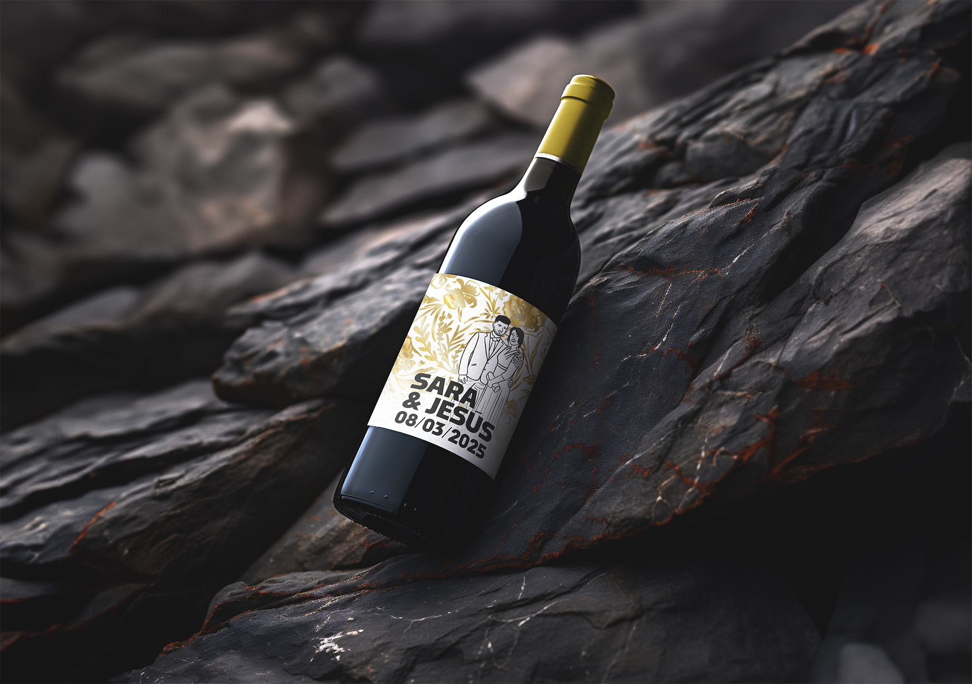 Diseño de etiqueta de vino estilo moderno con toques dorados. Realizado mediante Procreate, Illustrator y Photoshop